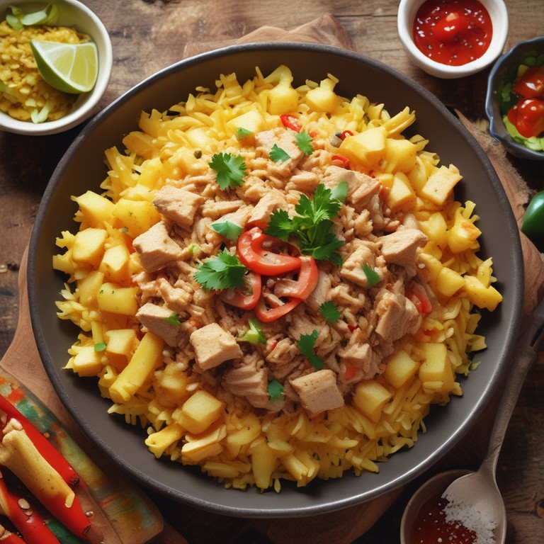 Un delicioso plato que combina arroz esponjoso con papas fritas crujientes y atún, ideal para una comida rápida y sabrosa.