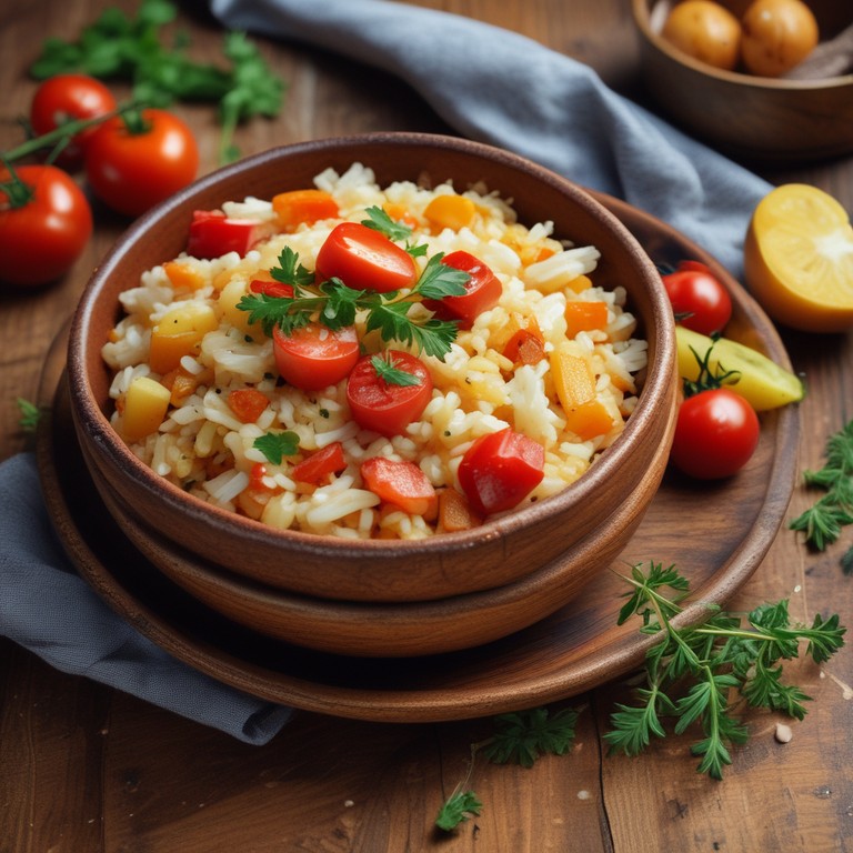 Un delicioso plato de arroz con tomate y papas, perfecto para acompañar cualquier comida.