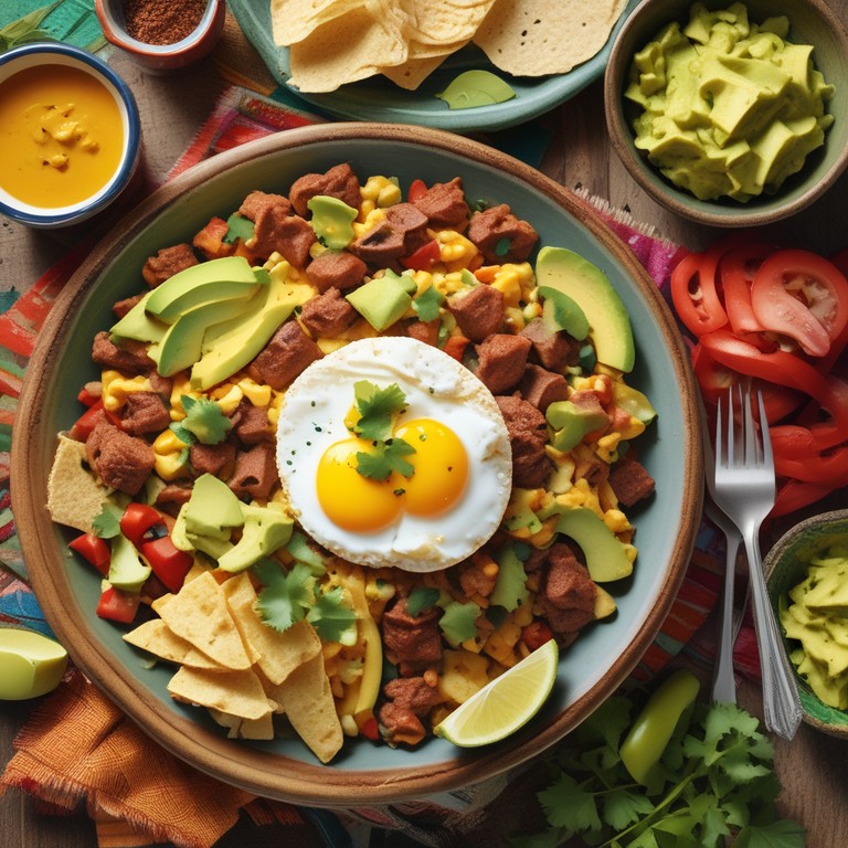 Un desayuno delicioso y fácil de preparar que combina huevos revueltos con salchicha, aguacate y totopos, ideal para principiantes en la cocina.