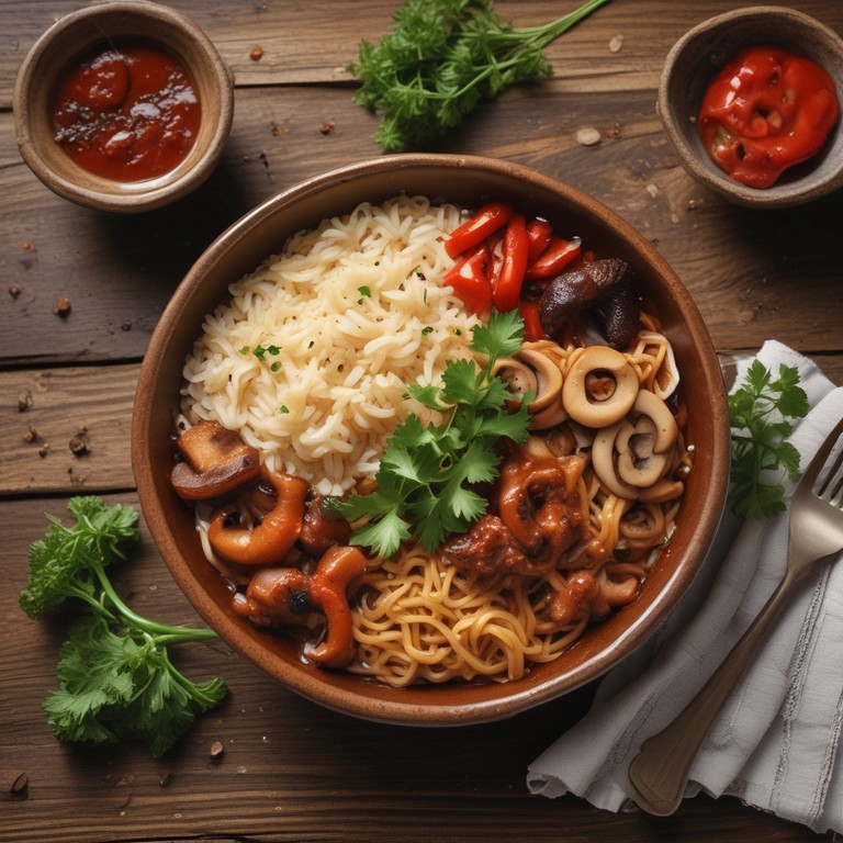 Un delicioso plato que combina arroz y fideos con champiñones y seitán en una sabrosa salsa de tomate, ideal para una comida nutritiva y satisfactoria.