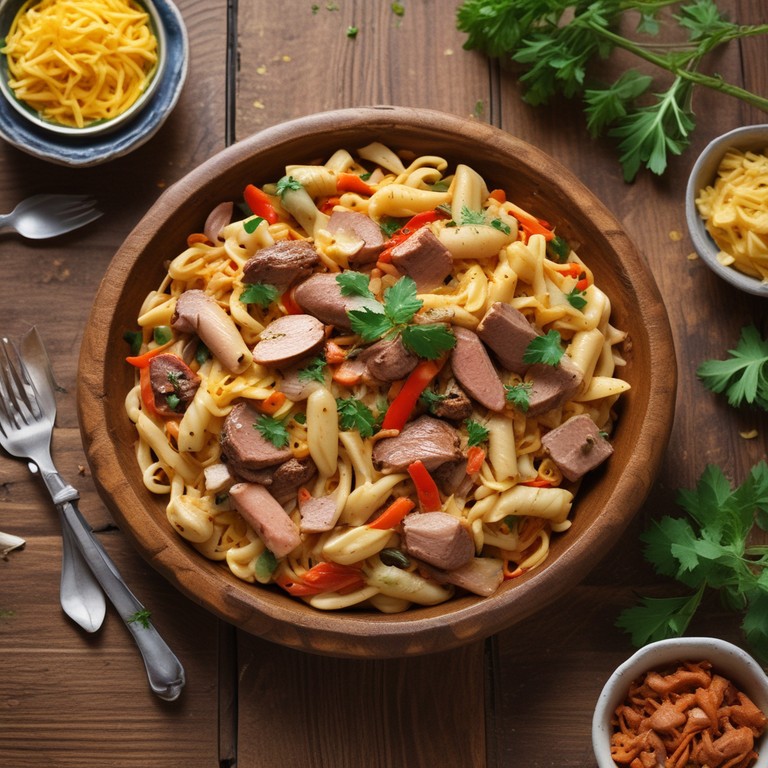 Un delicioso plato de fideos cremosos con carne y una mezcla de verduras que lo hacen nutritivo y sabroso. Perfecto para una comida familiar.
