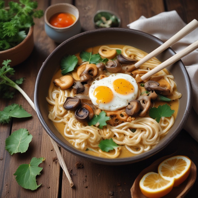 Un delicioso plato de fideos de arroz cocinados en una cremosa salsa de curry con leche de coco y hongos, perfecto para una comida reconfortante y llena de sabor.