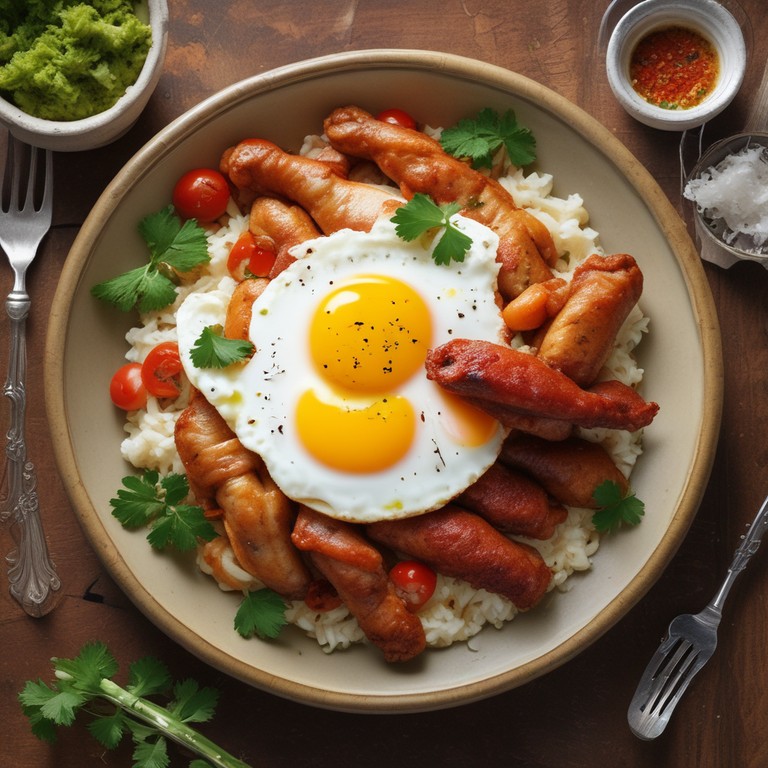Um prato saboroso que combina coxinha da asa de frango, bacon e calabresa com arroz pronto, perfeito para um almoço ou jantar. Os ovos fritos por cima adicionam um toque especial.