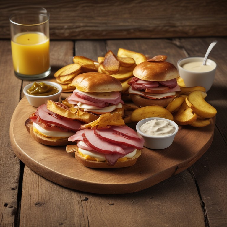 Una deliciosa combinación de sabores en un sándwich que mezcla salchicha, queso, jamón y platanitos fritos, ideal para un aperitivo o una comida rápida.