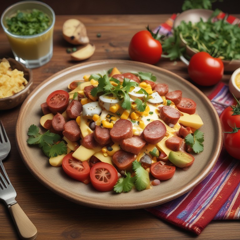 Un platillo delicioso y reconfortante que combina salchichas, papas y jitomates, cubierto con queso derretido. Perfecto para una comida rápida y sabrosa.