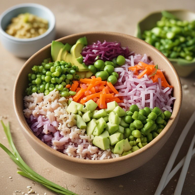 Este poke bowl saludable combina atún fresco con arroz integral y una variedad de verduras frescas, creando un plato nutritivo y delicioso.