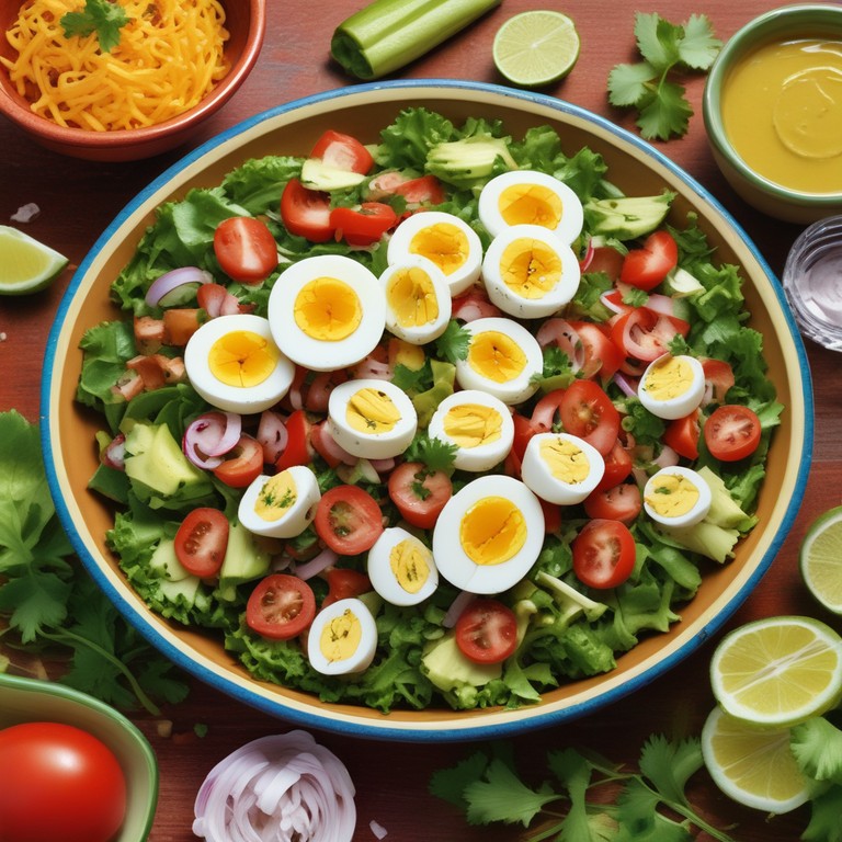 Esta ensalada fresca combina la crujiente jícama con el sabor suave del huevo y la frescura de la lechuga y el jitomate, perfecta para un día caluroso.