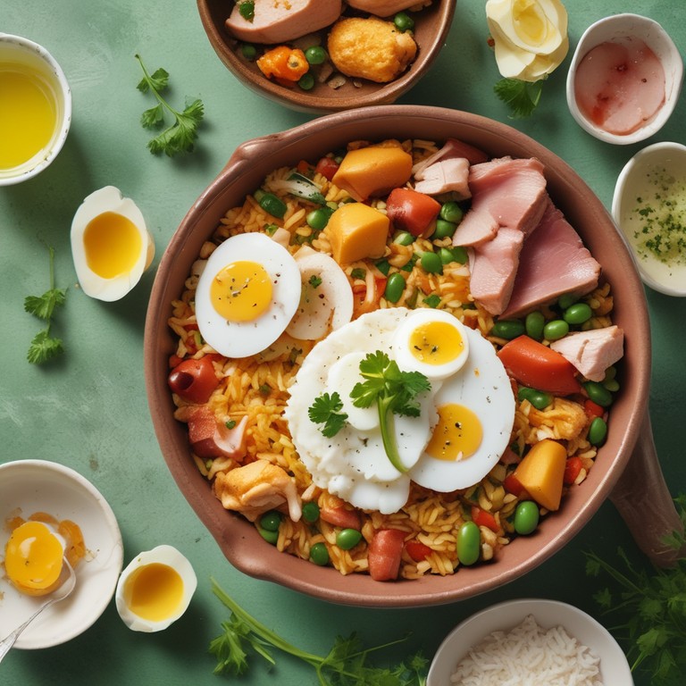 Un delicioso plato de arroz con pollo, huevo y jamón, ideal para una comida reconfortante y nutritiva.