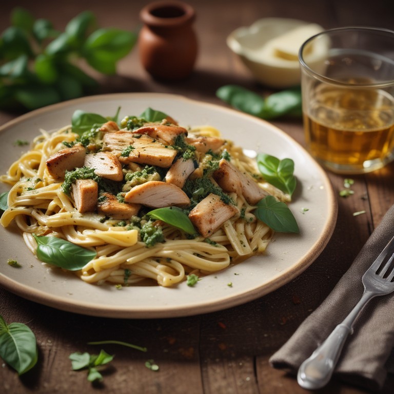 Una deliciosa pasta al pesto acompañada de pollo a la parrilla, perfecta para una comida italiana reconfortante y sabrosa.