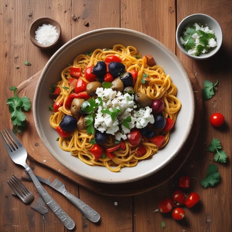 Una deliciosa receta de fideos con un toque mediterráneo, combinando fideos con verduras asadas y una salsa de tomate sabrosa.