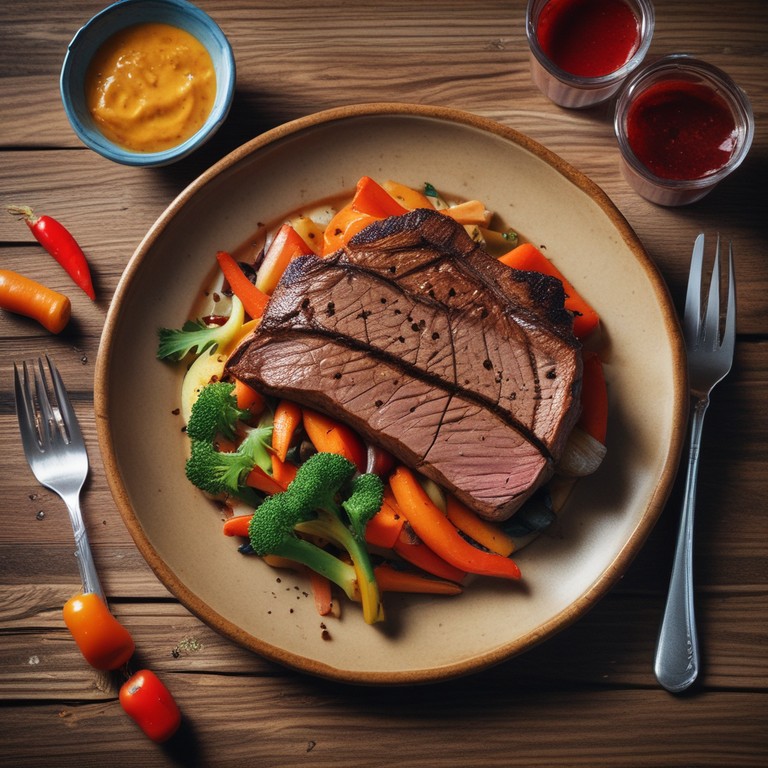 Un delicioso filete de Pepito acompañado de verduras salteadas, ideal para una comida reconfortante y llena de sabor.