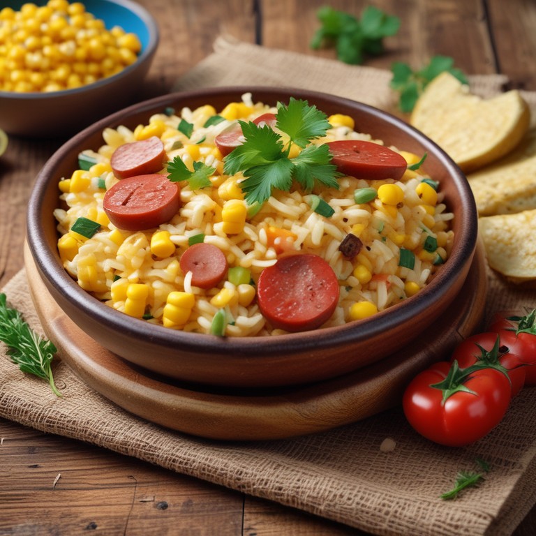 Un delicioso plato de arroz con maíz tierno y salchichas, perfecto para una comida reconfortante y llena de sabor.