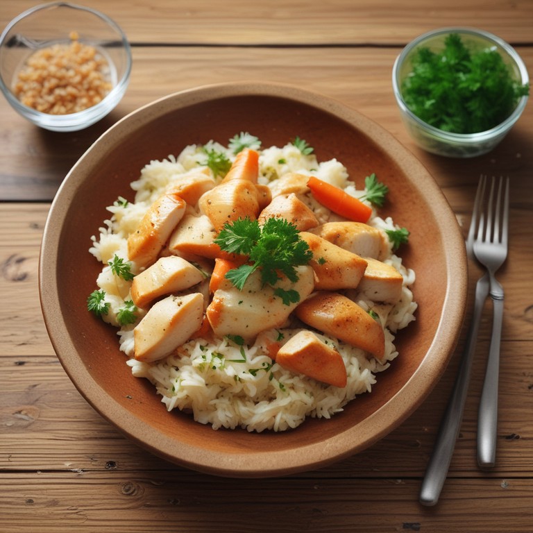 Un plato reconfortante de pollo, arroz y zanahorias, ideal para una comida familiar. Este plato combina sabores sencillos y nutritivos, perfecto para cualquier ocasión.