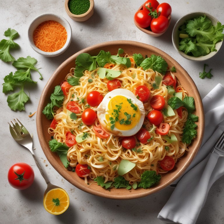 Un delicioso plato de fideos con pollo y huevo, servido sobre una cama fresca de lechuga y tomate, ideal para una comida nutritiva y sabrosa.