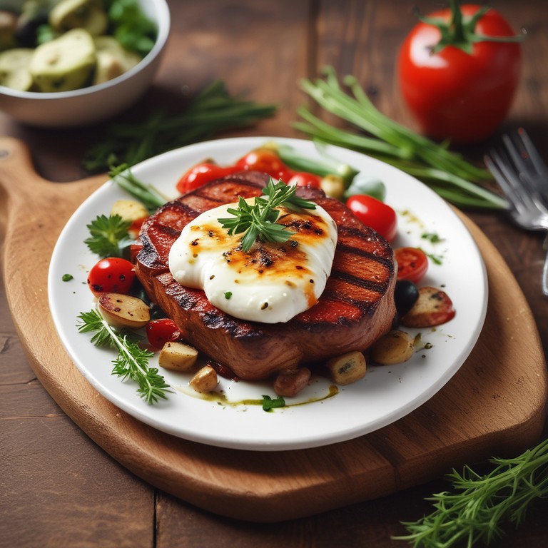Un delicioso bife de chorizo a la parrilla, cubierto con mozzarella fundida, perfecto para una comida especial o una parrillada con amigos.