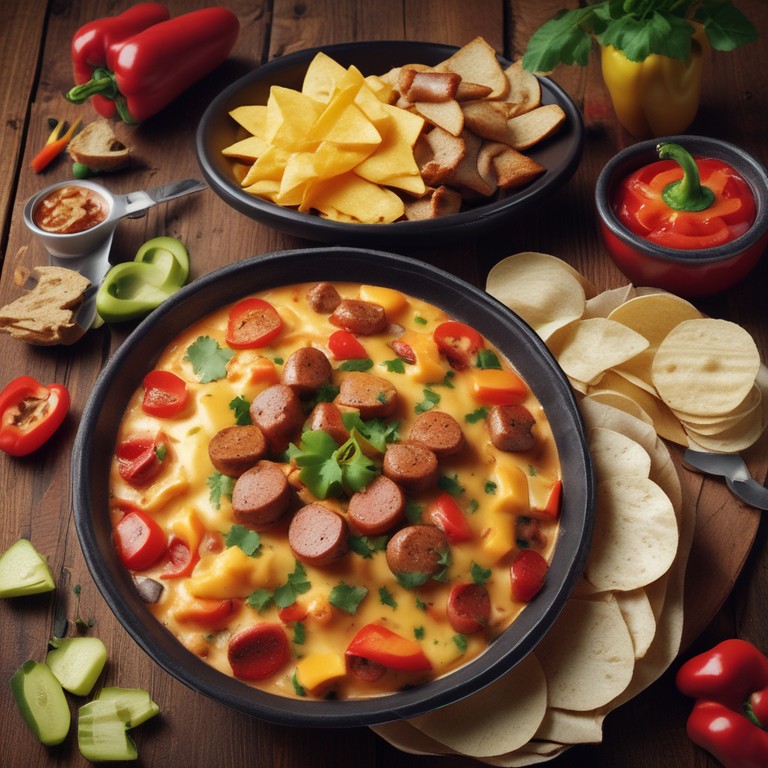 Un delicioso platillo que combina la cremosidad del queso con la salchicha y las papas, ideal para compartir en una reunión.