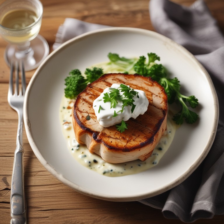 Deliciosos filetes de lomo de cerdo marinados en yogur griego y ajo, acompañados de una suave salsa de yogur, perfectos para una comida especial.