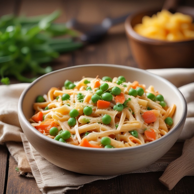 Een heerlijke en romige pastaschotel met doperwten en wortels, perfect voor een snelle en voedzame maaltijd.