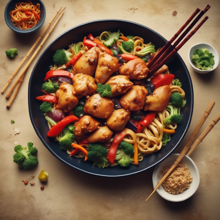 Este plato combina pollo tierno, fideos y una variedad de verduras frescas, todo salteado en una deliciosa salsa de soja. Perfecto para una comida rápida y saludable.