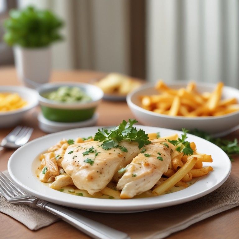 Este delicioso pollo a la crema es una receta reconfortante que combina la suavidad de la crema con el sabor del pollo, acompañado de papas fritas crujientes. Perfecto para una cena familiar.
