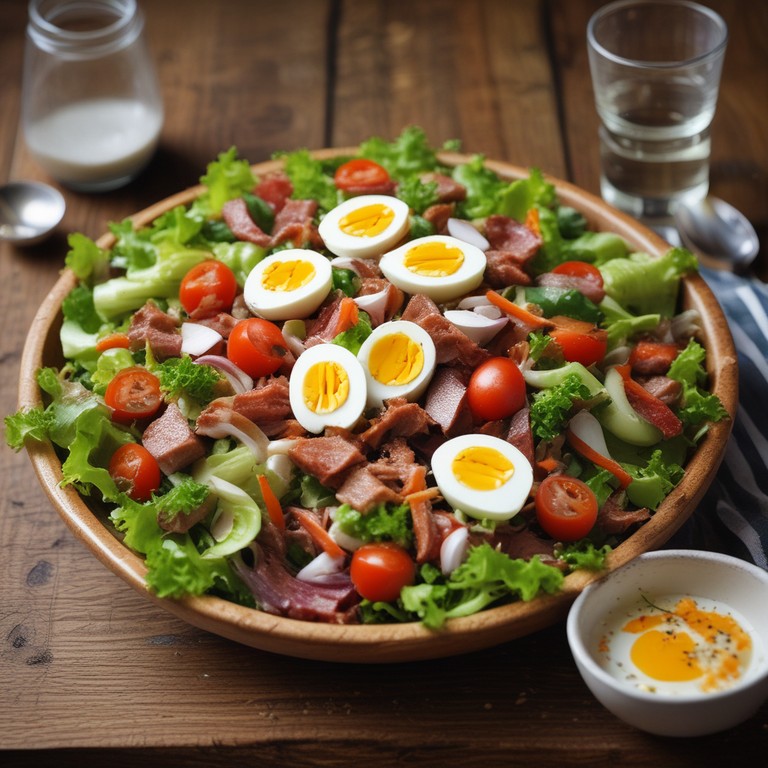 Una ensalada fresca y nutritiva que combina lechuga crujiente, zanahoria rallada, carne jugosa y huevo cocido, perfecta para una comida ligera o como acompañamiento.