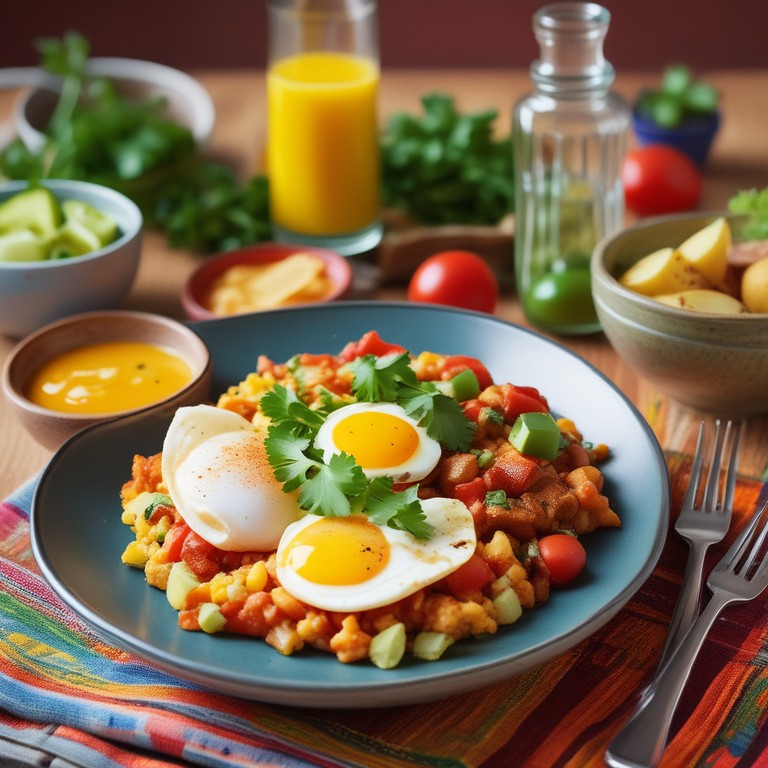 Un delicioso platillo mexicano que combina huevos revueltos con papas y un toque de jitomate y chile, ideal para un desayuno sustancioso.
