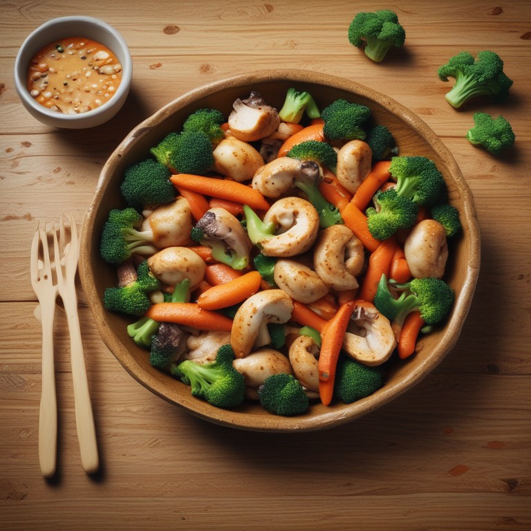 Un delicioso plato de pollo salteado con champiñones, brócoli y zanahorias, ideal para una comida saludable y llena de sabor.
