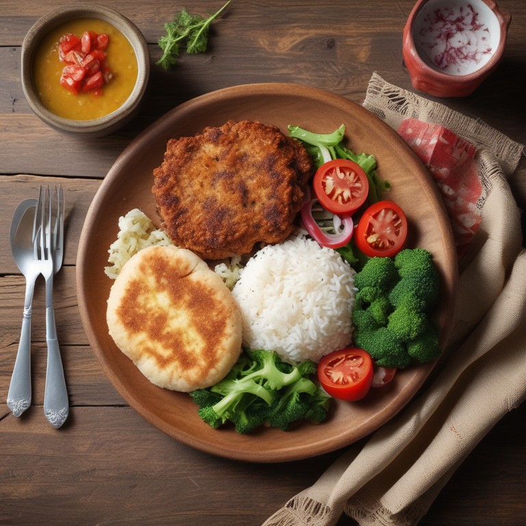 Una deliciosa milanesa de cerdo acompañada de arroz, brócoli al vapor, y arepas, perfecta para una comida familiar.