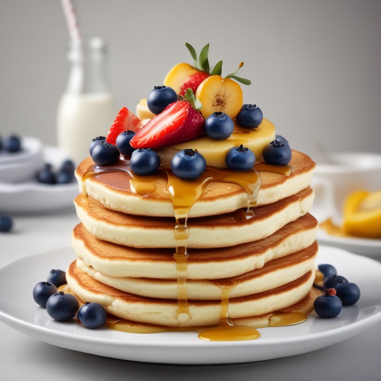 Deliciosos hotcakes esponjosos perfectos para el desayuno, acompañados de miel y frutas frescas.