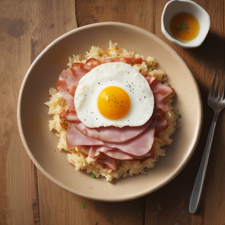 Un plato delicioso y reconfortante que combina arroz, huevo, jamón y queso, ideal para una comida rápida y sabrosa.