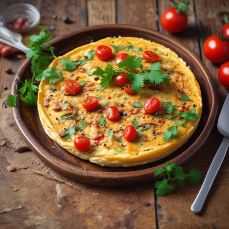 Una deliciosa tortilla española que combina pollo desmenuzado, lentejas y tomates cherry, perfecta para una comida nutritiva y sabrosa.