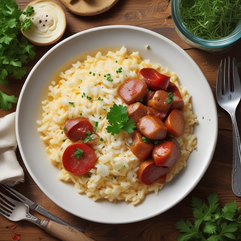 Un plato delicioso y cremoso que combina arroz, salchichas y chorizo, ideal para una comida reconfortante.