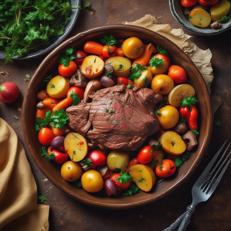 Un plato reconfortante de ternera tierna cocinada con verduras frescas y patatas al horno, ideal para una comida familiar.