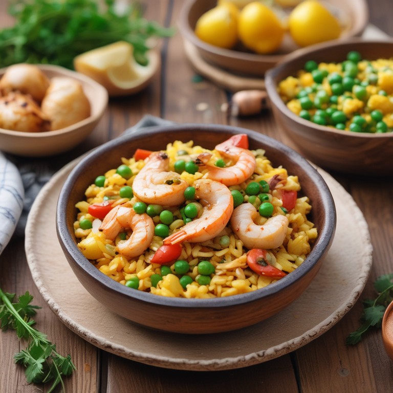 Un delicioso plato de arroz con pollo y camarones, perfecto para una comida familiar. Este plato combina sabores y texturas, con el pollo tierno, los camarones jugosos y las papas suaves, todo cocido a la perfección.
