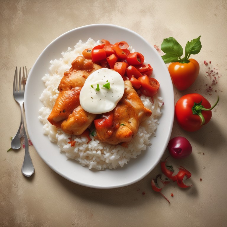 Una deliciosa receta de pechuga de pollo cocinada en una sabrosa salsa de tomate, acompañada de arroz esponjoso y verduras frescas.
