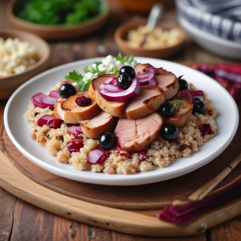 Un delicioso plato que combina el sabor intenso del lomo adobado con la frescura de una ensalada de remolacha y quinoa, ideal para una comida nutritiva y sabrosa.