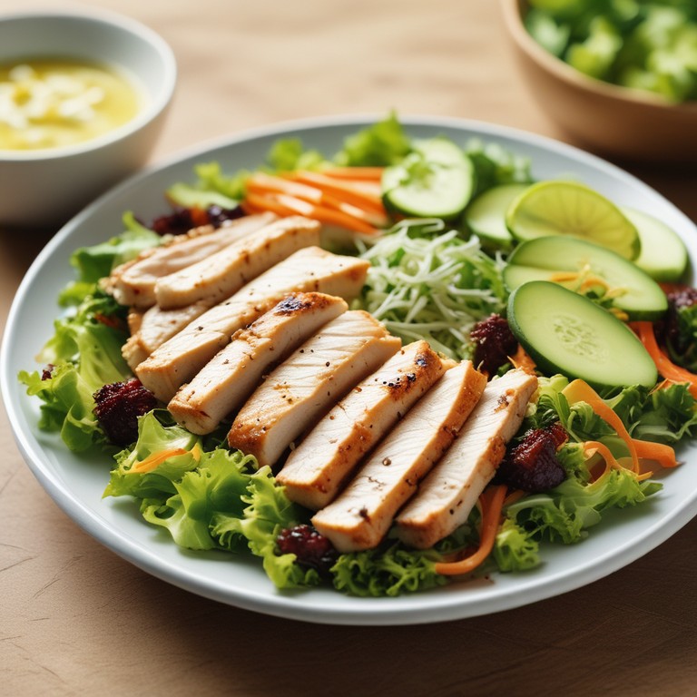 Esta ensalada fresca combina la suavidad del pollo a la parrilla con la textura del arroz integral y la frescura de las verduras, creando un plato saludable y delicioso.