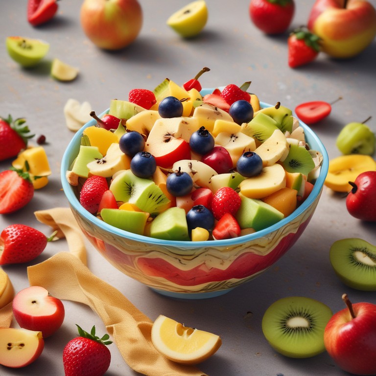 Una deliciosa ensalada de frutas frescas que combina la dulzura de las manzanas, plátanos, fresas, uvas y kiwis, aderezada con miel y jugo de limón para un toque refrescante.