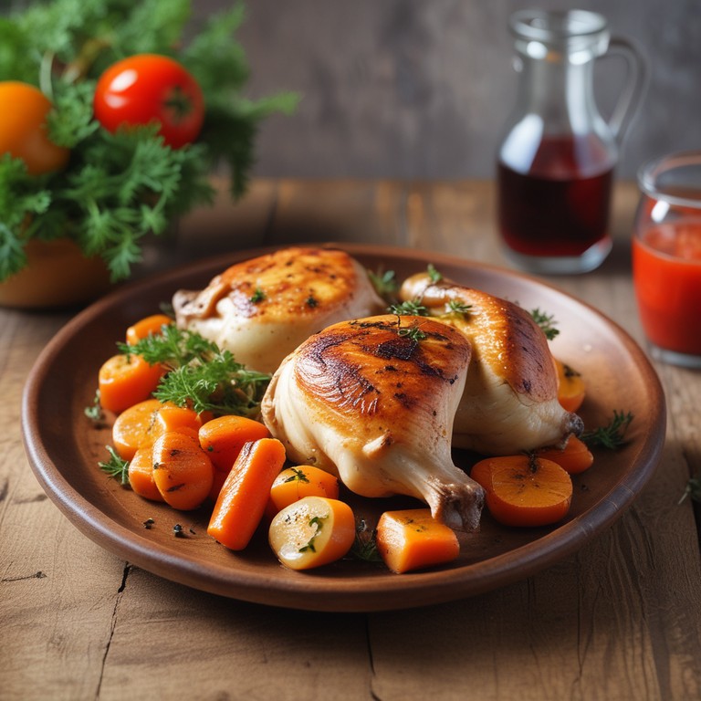 Un delicioso plato de pollo al horno acompañado de zanahorias, cebolla y tomate, ideal para una comida familiar.