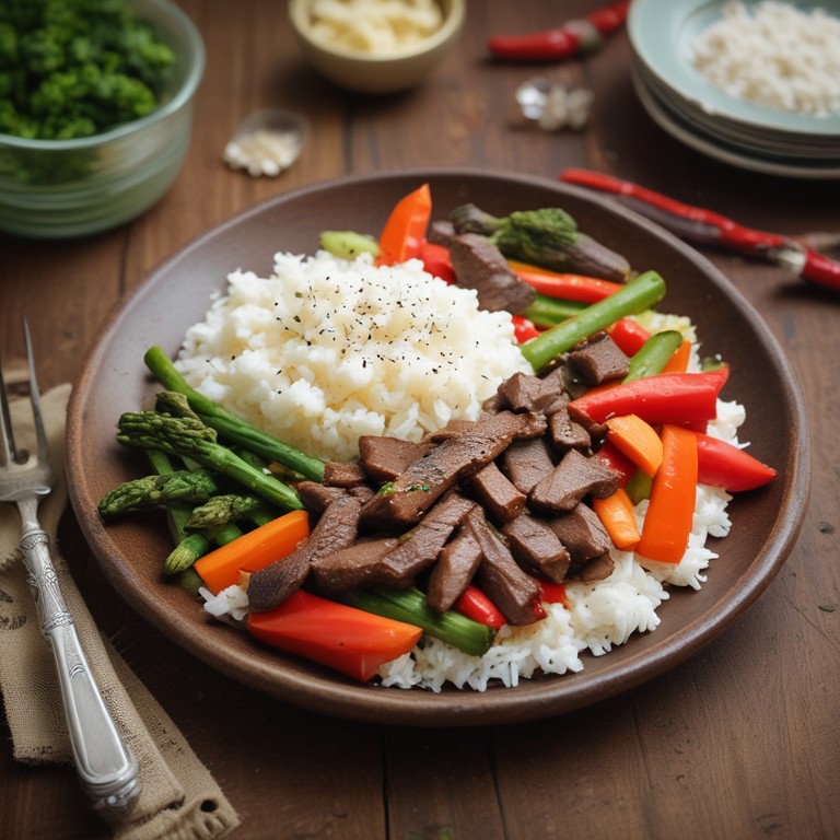 Un delicioso plato de hígado salteado con una mezcla de verduras frescas y arroz, ideal para una comida nutritiva y sabrosa.