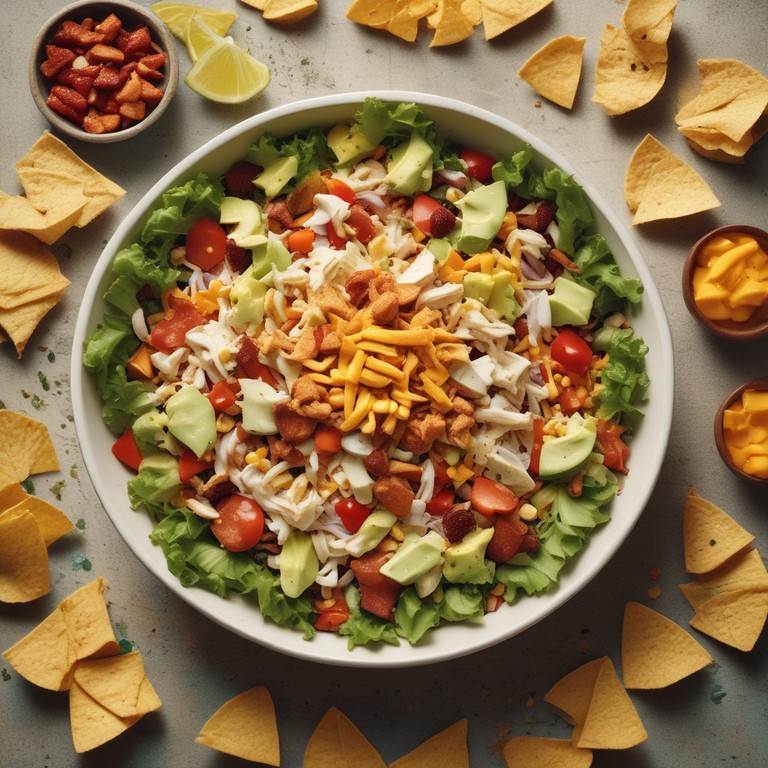 Una ensalada fresca y crujiente que combina pollo, chorizo y una variedad de chips para un sabor y textura únicos.
