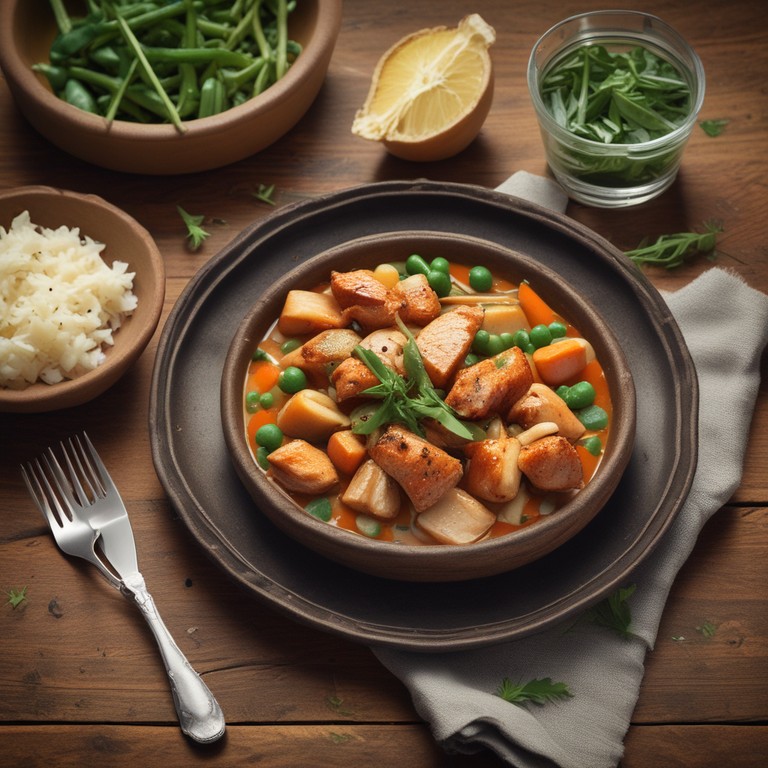 Un delicioso guiso de pollo con verduras frescas como vainitas y zanahorias, acompañado de yuca, ideal para una comida reconfortante y nutritiva.