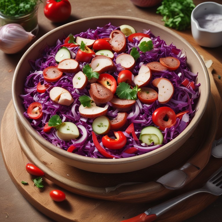 Uma salada refrescante e colorida que combina a calabresa defumada com vegetais frescos e um toque de maionese, perfeita para acompanhar churrascos ou como prato principal leve.