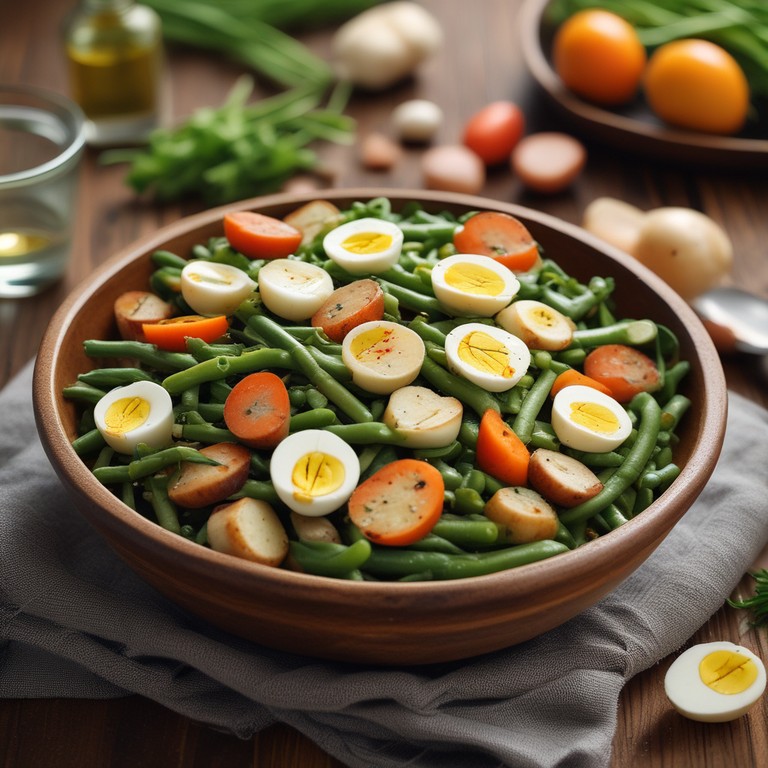 Una deliciosa y colorida ensalada que combina judías verdes, zanahorias, papas y huevos duros, perfecta como acompañamiento o plato principal ligero.