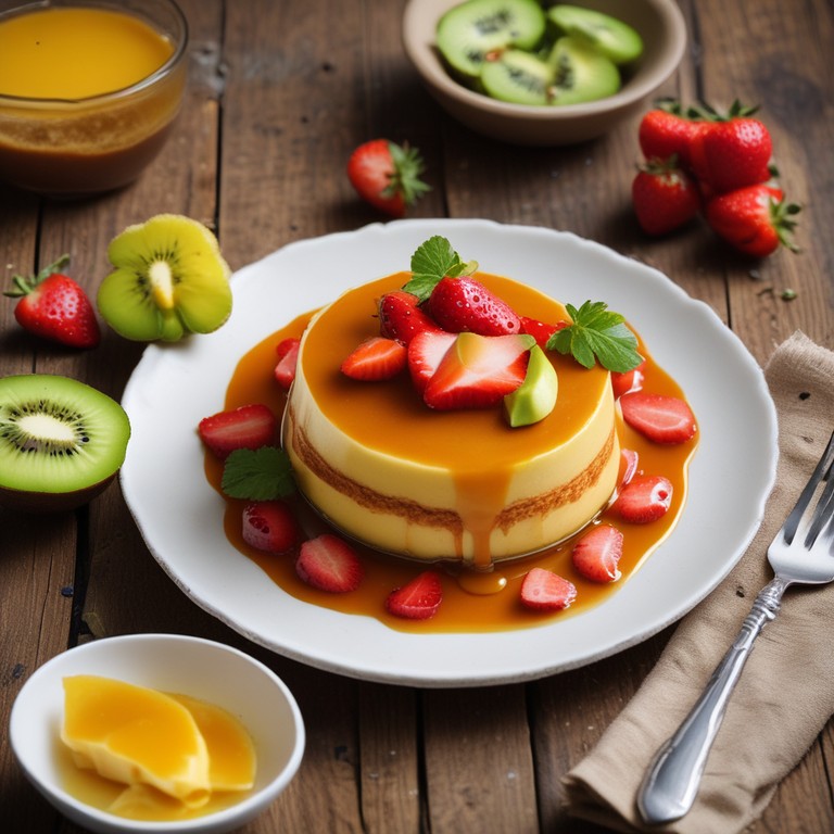 Un delicioso flan de huevo, suave y cremoso, acompañado de una dulce salsa de caramelo y decorado con frutas frescas, perfecto para cualquier ocasión.