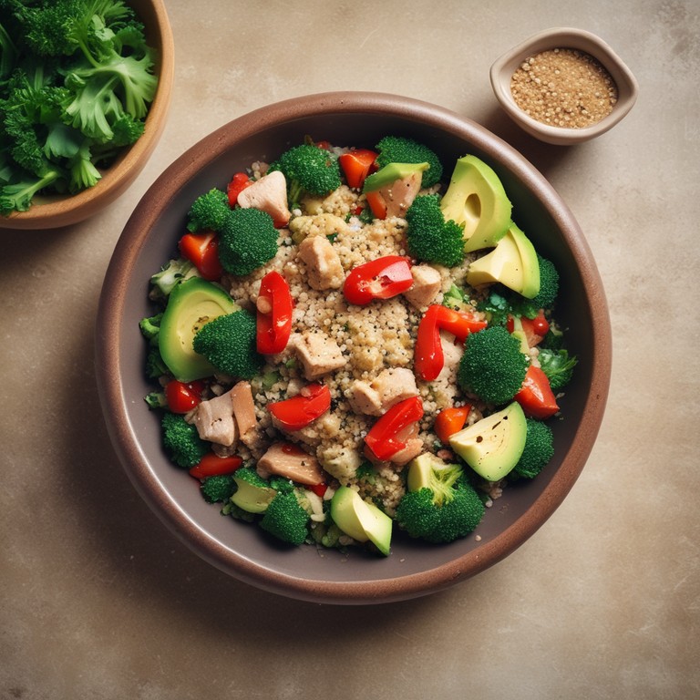 Una ensalada nutritiva y colorida que combina quinoa, pollo y verduras frescas, ideal para mejorar el sistema inmune y aumentar la masa muscular.