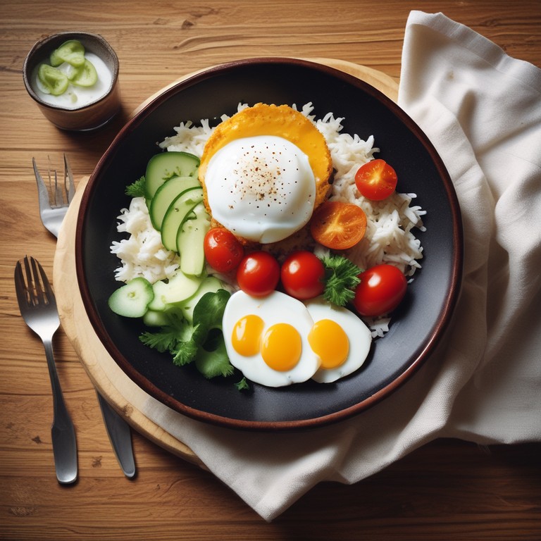 Un plato delicioso y nutritivo que combina arroz esponjoso, huevos frescos y una ensalada colorida, ideal para cualquier comida del día.