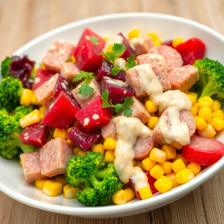 Una ensalada fresca y colorida que combina atún, beterraga, brócoli y choclo, ideal para un almuerzo ligero o como acompañamiento.