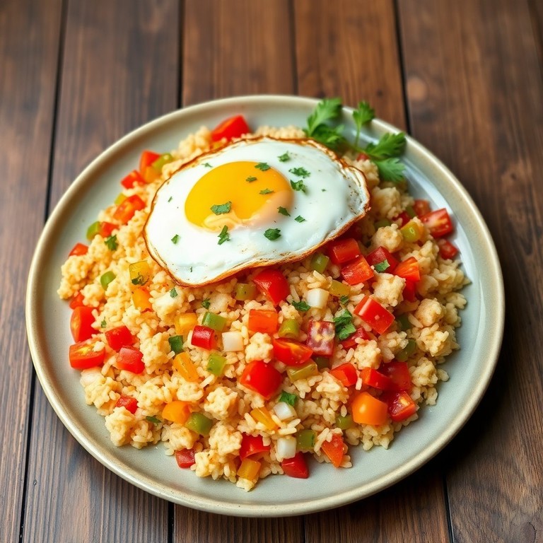 Un delicioso y colorido plato de arroz con huevo y verduras, ideal para una comida nutritiva y rápida.