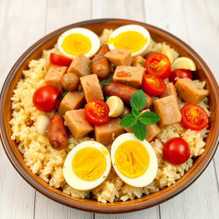 Un plato sabroso y nutritivo que combina arroz, atún y salchichas, perfecto para una comida rápida y deliciosa.